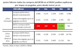 Siguiendo este razonamiento, una vez que el Fondo Monetario Internacional apruebe las metas del primer trimestre del año y libere unos US$ 850 millones comprometidos en el Facilidades Extendidas vigente; junto con la aceleración de la liquidación sojera, las reservas del BCRA volverán al terreno positivo.