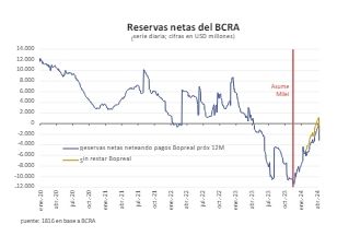 Se trata de un círculo virtuoso: al aumentar los depósitos privados en dólares, cae el riesgo de una corrida y los bancos se sienten más cómodos sin tener disponibilidades por el 100% de los depósitos (algo que ya se ve en los números del cuadro de arriba), las empresas exportadoras aprovechan para financiarse "barato" en dólares y el BCRA compra esas divisas. Gracias a este flujo es que las reservas netas del BCRA llegaron a estar casi en terreno positivo antes del pago al FMI del 30 de abril por US$ 2.800 millones (como se representa en el próximo gráfico). Descontando los pagos de Bopreal de los próximos 12 meses (en línea con la metodología del FMI), las reservas netas rondan ahora los US$ -2.800 millones, una cifra considerablemente menos dramática que los US$ -11.200 millones con los que comenzó la actual administración.