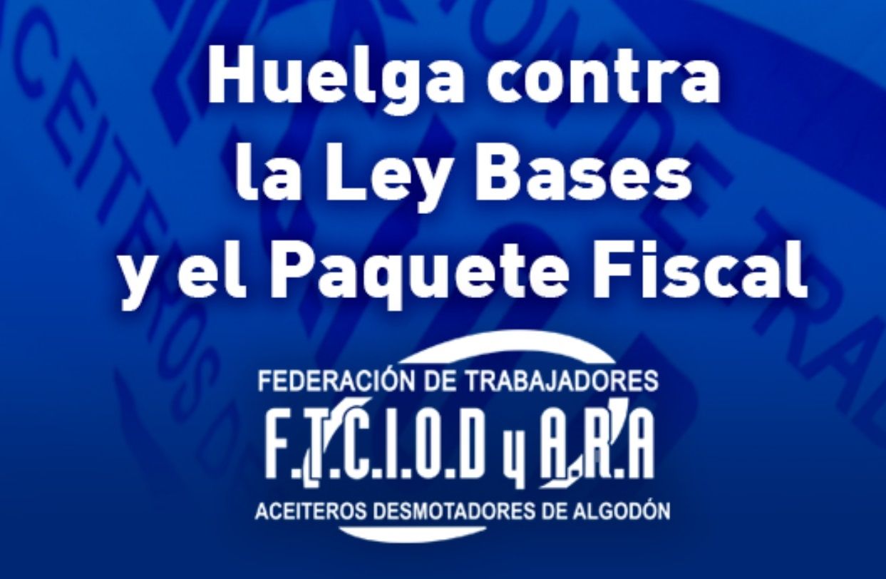 El gremio de los aceiteros y desmontadores anunció un paro "por tiempo indeterminado" desde este miércoles en rechazo a la ley Bases. La Federación de Trabajadores del Complejo Industrial Oleaginoso, Desmotadores de Algodón y Afines de la República Argentina (FTCIODyARA), realizará una nueva huelga para "exigir" al Senado que rechace el proyecto de ley que establece, entre otras, cambios en la legislación laboral y en el sistema impositivo.