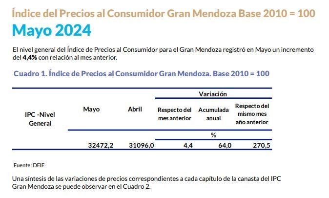 El nivel general del Índice de Precios al Consumidor, calculado por la DEIE (Dirección de Estadísticas e Investigaciones Económicas) para el Gran Mendoza registró en mayo una variación del 4.4% con relación al mes anterior. El dato publicado por el Gobierno local quedó apenas por encima del dato de inflación del Indec a nivel nacional, que fue del 4.2%.