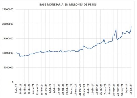 Entre el 7 de diciembre pasado y el 14 de junio, la base monetaria aumentó el 88,3%. La base monetaria se compone del circulante y de los encajes bancarios. El circulante aumentó el 75% y los encajes bancarios crecieron el 113% como consecuencia de un fuerte aumento de los depósitos bancarios, en particular de los depósitos a plazo fijo sin ajuste por CER ni UVA.