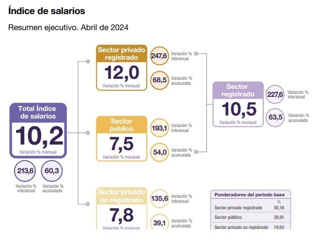 En términos interanuales, los incrementos por sector fueron del 247,6% en el sector privado registrado, 193,1% en el sector público y 135,6% en el sector privado no registrado, lo que muestra la fuerte debilidad de los dos últimos.