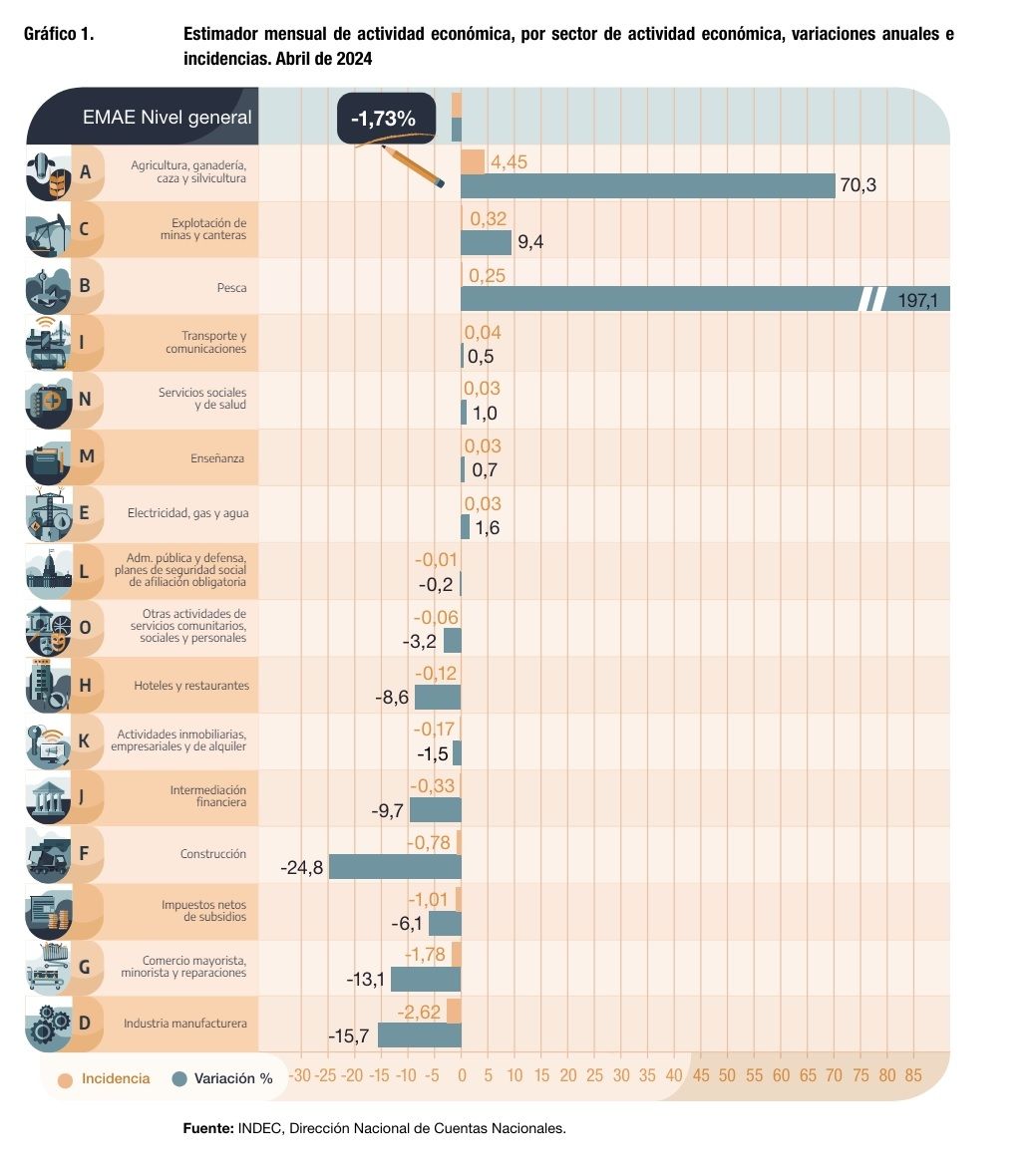 El EMAE (estimados mensual) que publica Indec, muestra que a contramano de lo que venía sucediendo en los últimos meses, siete sectores de actividad registraron subas. Entre destacan pesca con una mejora del 197,1% y agricultura, ganadería, caza y silvicultura con una suba de 70,3%. Hay que aclarar que este último sector compara con un mes de abril de 2023 en el pico de la sequía. También destacó la explotación de minas y canteras (9,4% de suba).