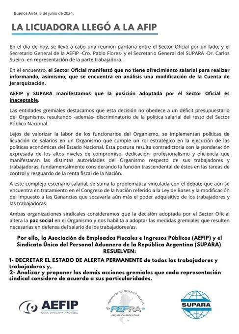 Además, llamaron la atención sobre el rol estratégico de los empleados de la AFIP en la consecución de los objetivos de la política económica del Estado nacional. Finalmente, plantearon que la decisión del Gobierno altera la "paz social" por lo que decretaron el "Estado de Alerta Permanente" y llevar adelante medidas de acción gremial directa.