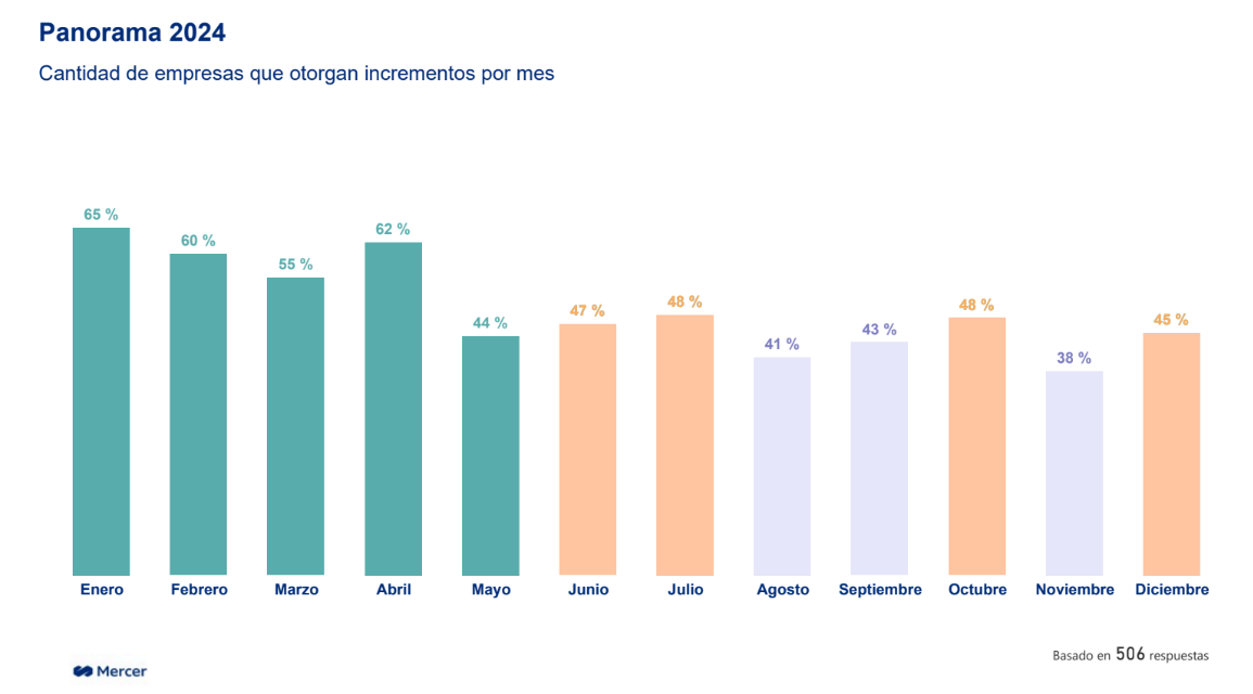 Respecto a la cantidad de ajustes previstos por las compañías, otorgar ajustes cada 2 meses sigue siendo la alternativa con mayor prevalencia. "Las empresas están reaccionando a la desaceleración de la inflación modificando sus proyecciones de aumentos salariales anuales especialmente con impacto en el segundo semestre. En tal sentido, en nuestro relevamiento del mes de mayo observábamos que el 65% de las empresas proyectaban 6 o más incrementos a lo largo del año mientras que en el mes de junio ese porcentaje descendió a 60%", explicó Mercedes Bernardi, gerente SR de Desarrollo de Nuevos Negocios en Mercer Argentina, Uruguay y Paraguay.