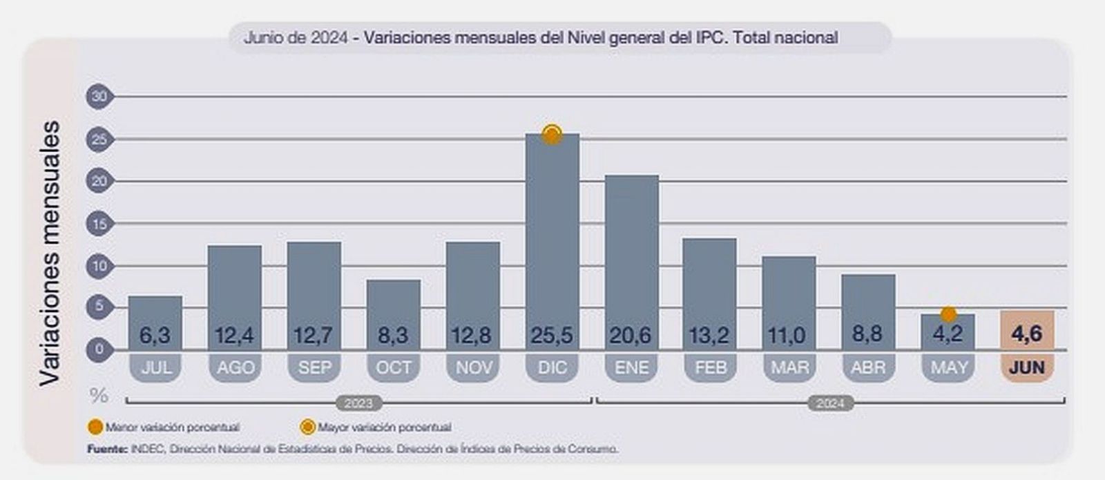 En los últimos doce meses, en tanto, llegó al 271,5%, lo que implica un retrocesp respecto del 276,4% que marcó mayo, según informó el Instituto Nacional de Estadística de Censos (Indec). Desde el Gobierno vaticinan que en la segunda mitad llegará una sensible baja de la inflación interanual.