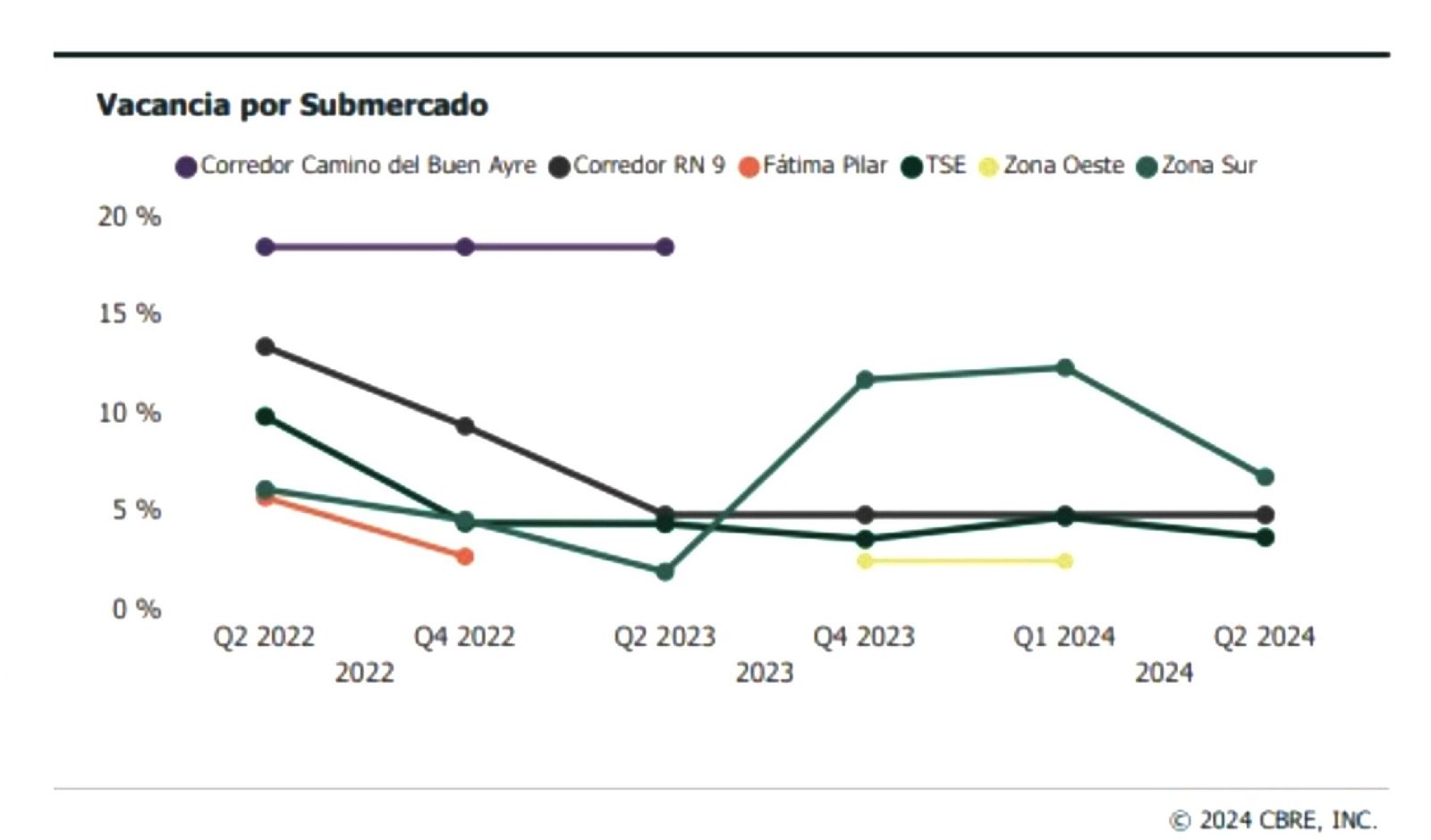 El mercado inmobiliario de centros logísticos cerró el primer semestre del año con números positivos. La tasa de vacancia, es decir espacios disponibles, fue del 3,35%, lo que implica un ajuste a la baja en 1,8 puntos porcentuales en el segundo trimestre 2024, según el último informe elaborado por CBRE Argentina.