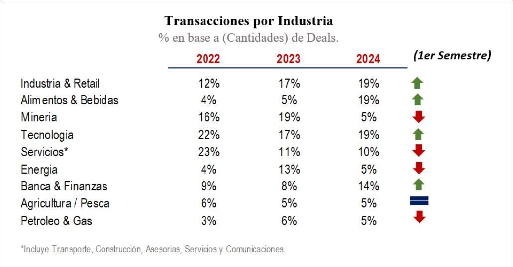 Los sectores más activos en términos de cantidad de deals en el primer semestre son Alimentos & Bebidas, Tecnología, Banca y Finanzas e Industria, en conjunto estos sectores representan el 65% del total de las transacciones.
