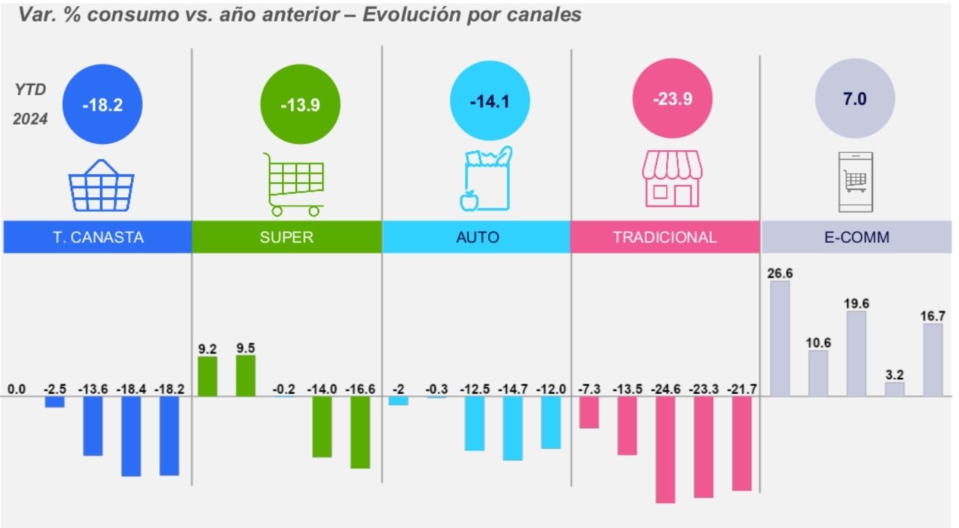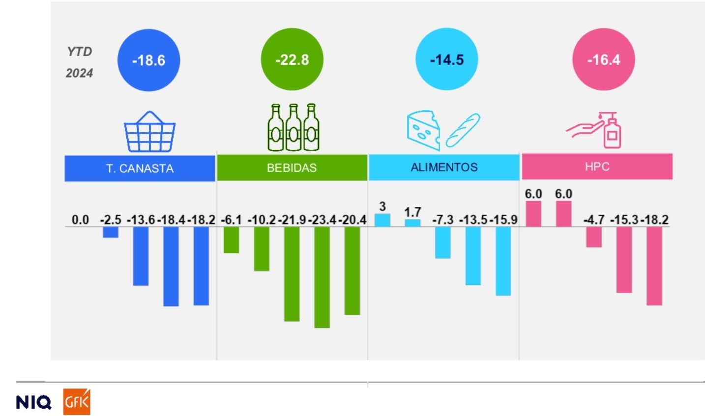 “Durante esta primera mitad del año, el 94% de las categorías se contrajo en 2024, sin embargo, el impacto no es igual para todas. La mayor parte de las categorías de alto desembolso cae por encima del promedio de la canasta, mientras que las categorías