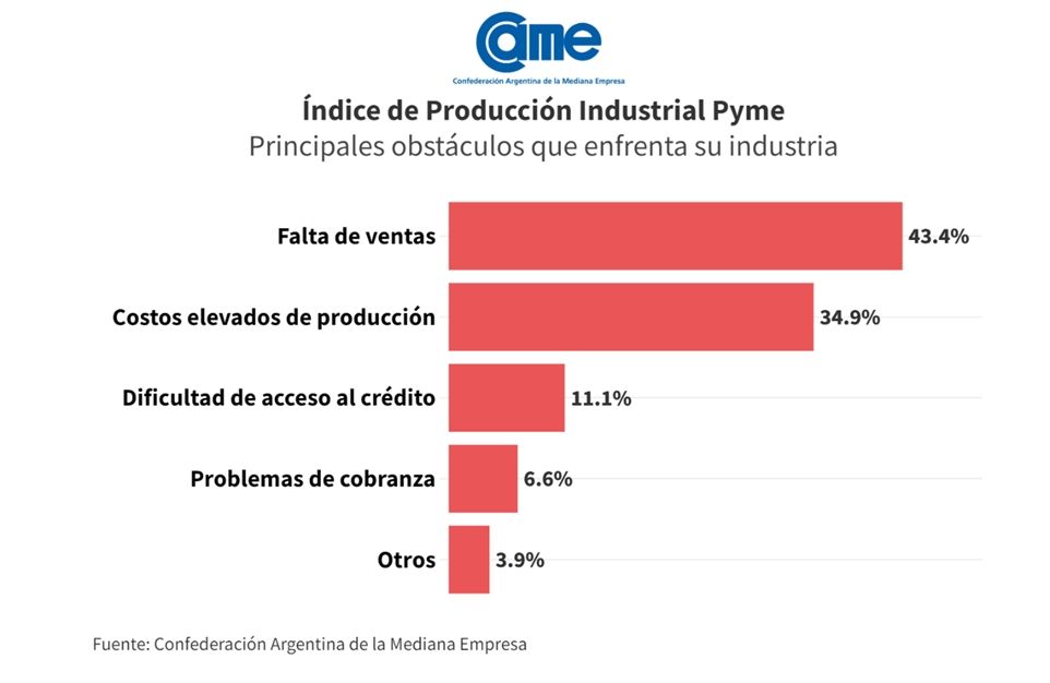 Los datos surgen del Índice de Producción Industrial Pyme (IPIP) que elabora la Confederación Argentina de la Mediana Empresa (CAME), con una muestra que alcanzó a 420 industrias pyme a nivel federal.