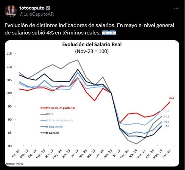 El ministro de Economía, Luis “Toto” Caputo fue uno de los primeros referentes del Gobierno en hacerse eco de los números difundidos por el Indec. En la red social X fue que compartió el mensaje de la cartera que comanda, donde celebraron el “segundo mes consecutivo de recuperación salarial”, y después publicó un grafico que mostraba que “el nivel general de salarios subió 4% en términos reales”.