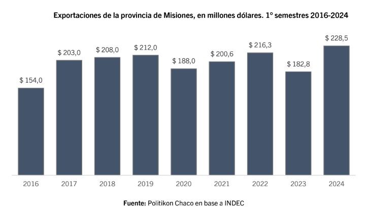 Las exportaciones con origen en Misiones totalizaron US$ 228,5 millones al primer semestre, con un crecimiento del 25% en comparación con igual período del año previo. El alza es superior al observado a nivel país (+14,0%). Además, se observa que en 2024 las exportaciones de Misiones fueron las más altas para un primer semestre desde, por lo menos 2016, según un informe de la consultora Politikon Chaco, en un informe en base a datos del INDEC que publica el sitio web www.economis.com.ar.