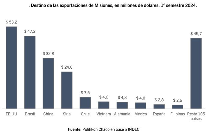Los productos misioneros exportados durante el período de análisis llegaron a 115 países. El principal socio comercial fue Estados Unidos con US$ 52,3 millones (23,3% del total misionero). De ese total, los productos de mayor exportación a ese país fueron té (56% del total) y madera (27%).