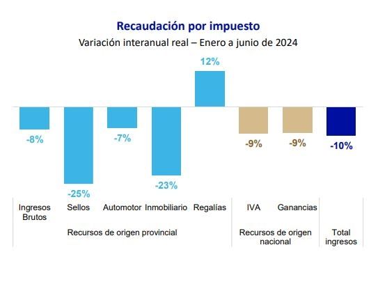 Por su parte, los ingresos de origen provincial se redujeron un 8% en términos reales en los seis primeros meses del año. En este punto, se dio un descenso de 8% en la recaudación de ingresos brutos, el principal tributo local, lo cual equivale a una disminución de los ingresos provinciales de $5.507 millones mensuales respecto al año 2023.