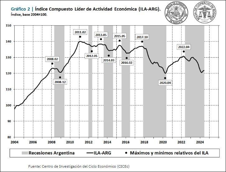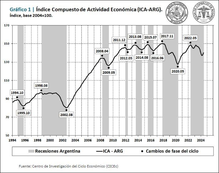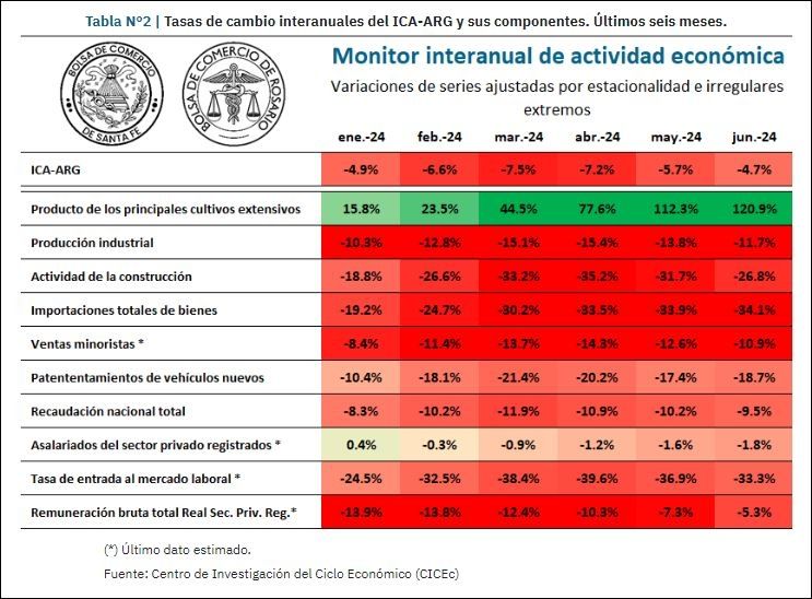 "El detalle presentado previamente pone en evidencia una situación económica compleja. En este sentido es de destacar la caída interanual que registra el ICA-ARG durante junio de 2024, -4,7%. Ello refleja una atenuación de la caída en los últimos meses, pero debe destacarse que las tasas interanuales alcanzaron niveles negativos sólo superados por la crisis 1998-2002 y la cuarentena por el Covid 19, si contemplamos desde 1994", indicaron desde las Bolsas de Comercio de Rosario y Santa Fe.