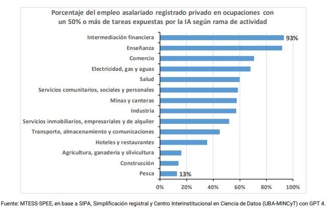 Por otra parte, como lo señala el informe, los sectores que tendrían el empleo más expuesto a la IA son: Intermediación financiera (93%) y Enseñanza (92%). En ambos sectores, más del 80% de los puestos de trabajo cuentan con ocupaciones con un 50% o más de tareas expuestas por la IA.