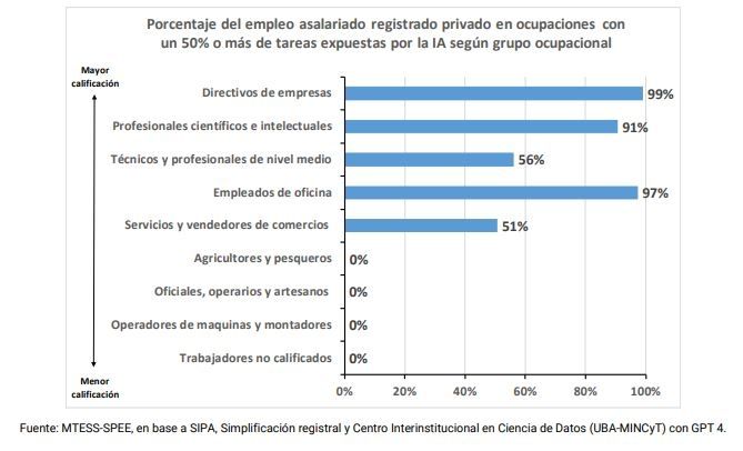El informe titulado "Impacto de la Inteligencia Artificial generativa en el empleo asalariado registrado del sector privado: diagnóstico y respuestas de política” advierte que, a diferencia de lo que ha sucedido en las grandes revoluciones industriales anteriores, donde los puestos trabajo físico resultaron más afectados, en este caso, los puestos de mayor riesgo a ser reemplazados son los de directivos de empresas, profesionales científicos e intelectuales y empleados de oficina, seguidos en menor medida por técnicos y profesionales de nivel medio y servicios y vendedores comerciales.