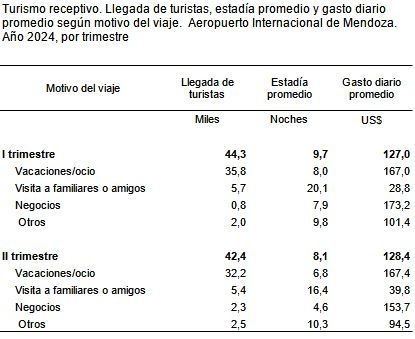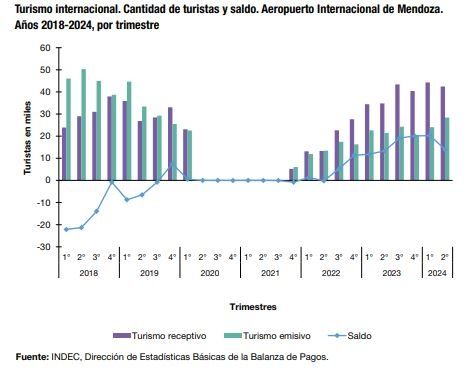En el Aeropuerto Internacional de Mendoza, se estimaron 42.400 turistas no residentes, con un aumento de 22% en relación al segundo trimestre de 2023. Se registraron 28.400 turistas residentes, 32,5% más que lo registrado en igual período de 2023. El saldo fue positivo en 14.000.