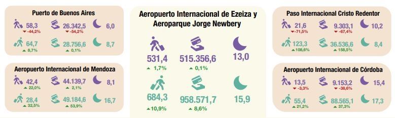 El 71,8% del turismo receptivo provino de países limítrofes, los principales fueron: Brasil, que aportó 32,4%; Uruguay, 16,4%; y Chile, 10,3%. El 53,8% de los turistas no residentes arribó a Argentina a través de la vía aérea; el 35,5% utilizó la vía terrestre; y el 10,7% restante llegó por vía fluvial/ marítima. Los pasos relevados por la ETI representaron el 58,6% del turismo receptivo.