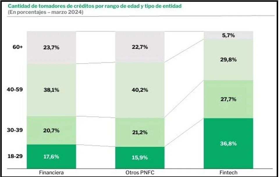 La tendencia de crédito Fintech al público de jóvenes entre 18 y 29 se acentúa, de modo que la participación en la cartera de este tipo de entidades creció 0,6 puntos llegando al 36,8% sobre el total.