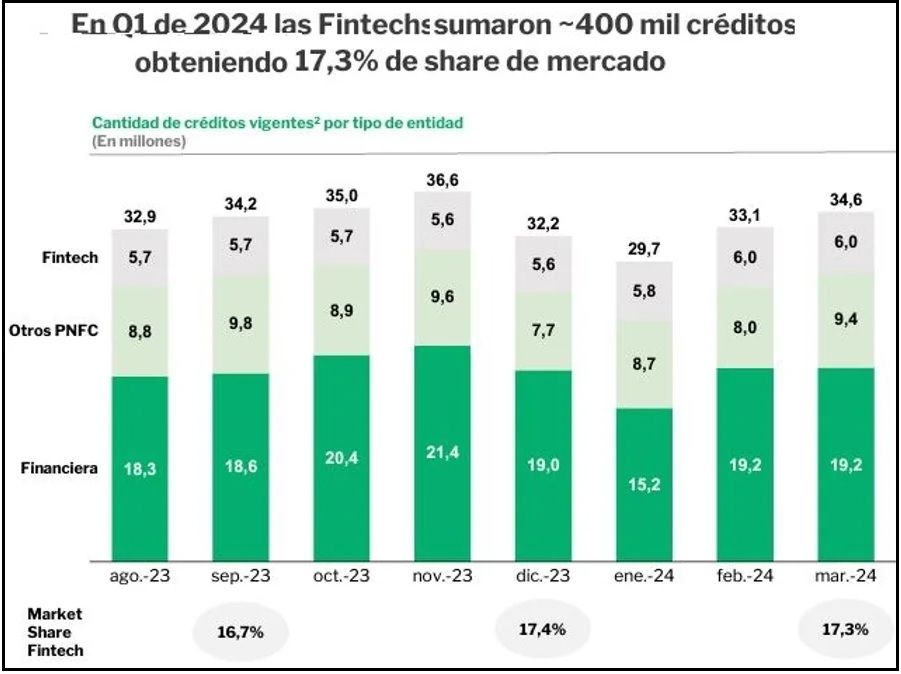 En marzo de 2024, la cantidad total de préstamos vigentes (incluyendo tarjetas, préstamos personales, prendarios, hipotecarios, entre otros) se ubicaba en 34,6 millones unidades, a un promedio de 110 mil pesos: los Fintech sumaron 400 mil, con lo que alcanzaron los 6 millones.