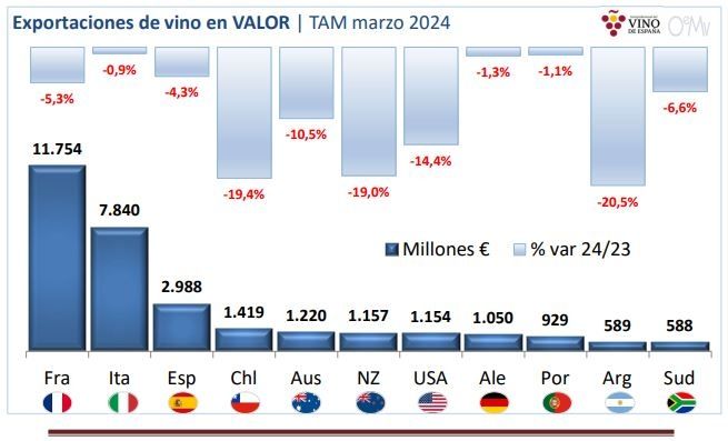 Un panorama similar se dio en el valor, donde Argentina ocupó el puesto 10 (por encima de Sudáfrica), pero con una baja de 20,5% respecto a marzo de 2023, con una facturación de 589 millones de euros. En este sentido, un dato general que puede complicar aún más la citación del país es que, según la OEMV, es que los vinos europeos ganan terreno frente a los de Nuevo Mundo.