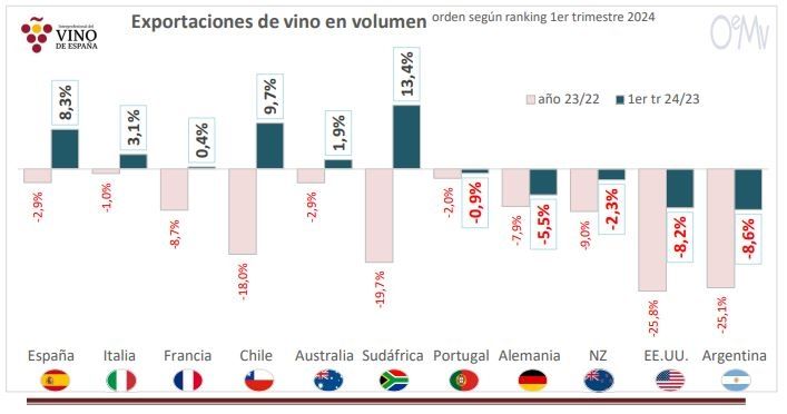 Sin embargo, de acuerdo a los expertos, se observan síntomas de recuperación al primer trimestre del año, ya que en el periodo se promedió un aumento de 3,1% en el volumen de vino exportado a nivel mundial, conforme la presión inflacionista se va suavizando, como marca el organismo español.