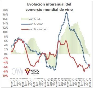 Tras sobreponerse a la crisis provocada por la pandemia de Covid-19 (afectó más a la facturación que al volumen) y batir récords históricos en valor en 2022, el comercio mundial ya cerró con caídas en 2023. Este 2024 parecería prolongar esa tendencia, con la caída interanual en marzo de 5,4% en volumen y de 6,4% en valor, llegando hasta los 9.883 millones de litros (-567 millones) y los 35.594 millones de euros (-2.433 millones), a un precio medio un 1% inferior, hasta los 3,60 €/litro.
