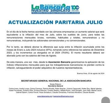 La Bancaria, la entidad sindical que reúne a los trabajadores del sector, informó a través de un comunicado, que se acordó con las cámaras empresarias “un aumento salarial que será equivalente a la inflación del mes de julio (4%), sobre los sueldos de Junio".