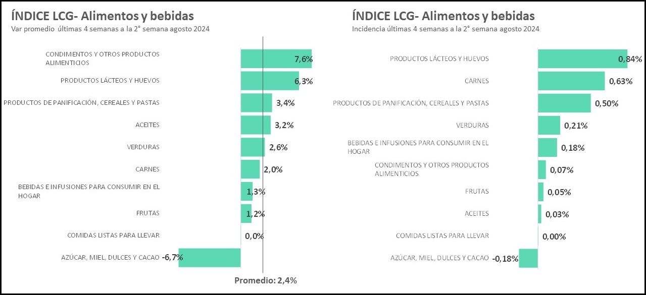 Previamente, la consultora LCG dio a conocer un informe sobre la tendencia de aumentos en alimentos y bebidas, también de la segunda semana de agosto, en el que marcó que luego de 14 meses, hubo una caída de precios del 0,1%. La baja marginal de la inflación semanal obedeció a la variación negativa de Lácteos y Verduras, que fueron compensadas por las subas de Carnes y Frutas.