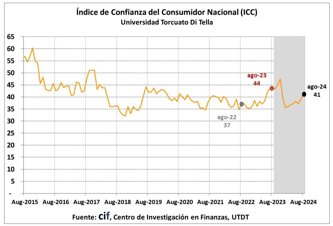El Índice de Confianza del Consumidor (ICC), medido por el Centro de Investigación en Finanzas de la Universidad Torcuato Di Tella (UTDT), subió en el mes de agosto un 6,03%. El dato superó el dato del mes anterior que había sido del 5,02%, con lo que cambió la tendencia del año que en los meses anteriores había resultado claramente negativa.