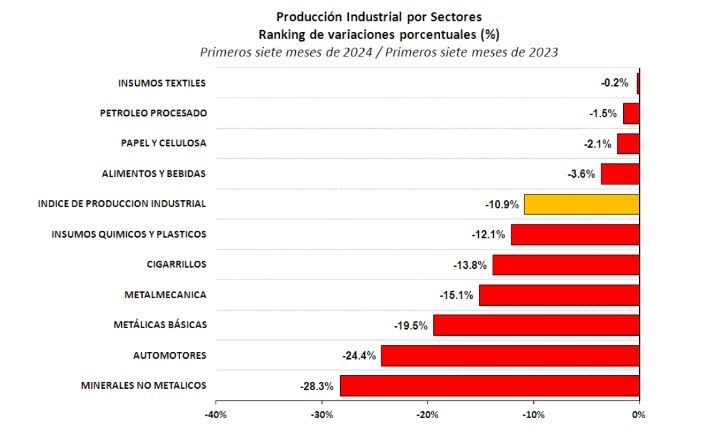 La rama de actividad que acumuló el mayor retroceso fue el de los minerales no metálicos con una contracción de 28,3%, seguida de la producción automotriz que acumula una caída del 24,4%, las industrias metálicas básicas 19,5%, la metalmecánica 15,1%, despachos de cigarrillos 13,8% y la producción de químicos y plásticos 12,1%, en cada caso en los primeros siete meses y en la comparación con el mismo período del año pasado.