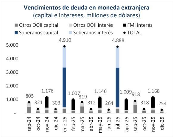"Más allá que este stock no resulta muy abultado en perspectiva histórica (en 2004 era el 90% del producto y en 2020 el 80%, por mencionar algunos ejemplos), los vencimientos de capital e intereses en moneda extranjera se perciben importantes en un marco de escasez de dólares y mercados internacionales virtualmente cerrados. En efecto, las reservas netas se ubican actualmente en terreno negativo: - US$ 5.200 millones, con dificultades de acumular divisas hacia delante. En este punto, debe recordarse que la existencia del dólar blend dificulta que se puedan acumular unos US$ 1.400 millones mensuales (considerando las exportaciones de julio)", observaron los especialistas en el reporte al que MDZ tuvo acceso.