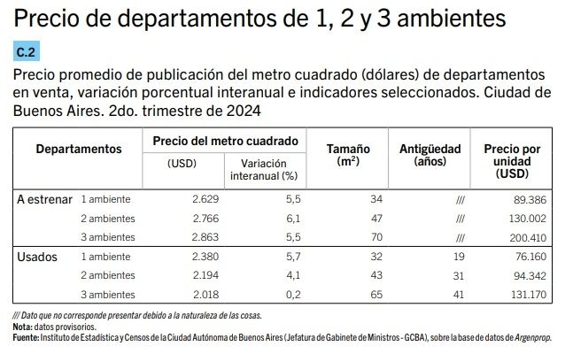 Para el Instituto de Estadística y Censos de la Ciudad Autónoma de Buenos Aires (IDECBA), se observó un aumento interanual en el precio de publicación del m2 en venta de los departamentos usados y a estrenar, que promedió un 4,5% para el conjunto de la Ciudad.