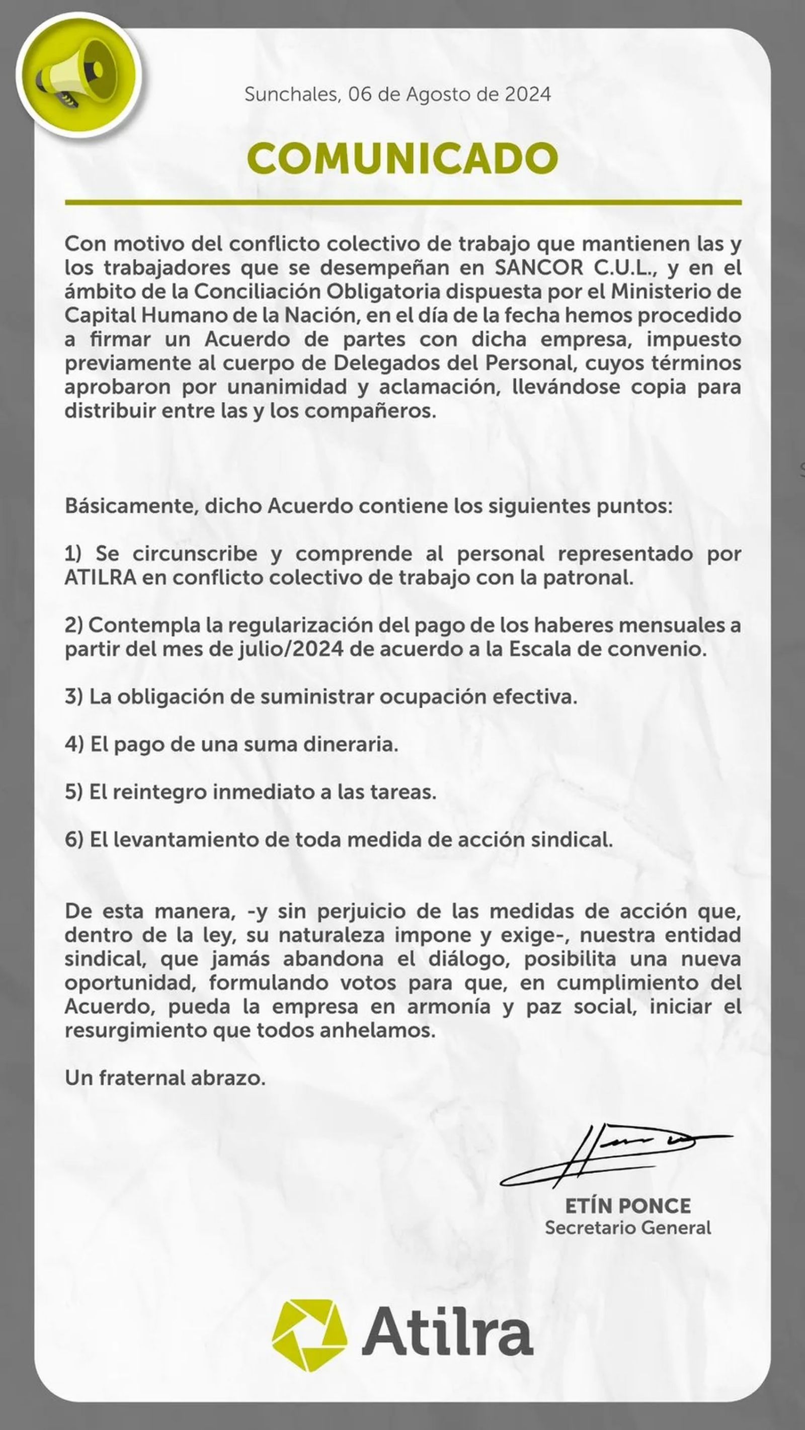 En un comunicado que lleva la firma del titular de Atilra, Héctor Ponce, se anunció que se regularizará el pago de los haberes mensuales a partir del mes de julio de 2024 de acuerdo a la escala del convenio, que la empresa se compromete a "suministrar ocupación efectiva" con reintegro inmediato a las tareas y que se realizará el pago de una suma dineraria. La parte gremial se compromete al levantamiento de toda medida de acción sindical.