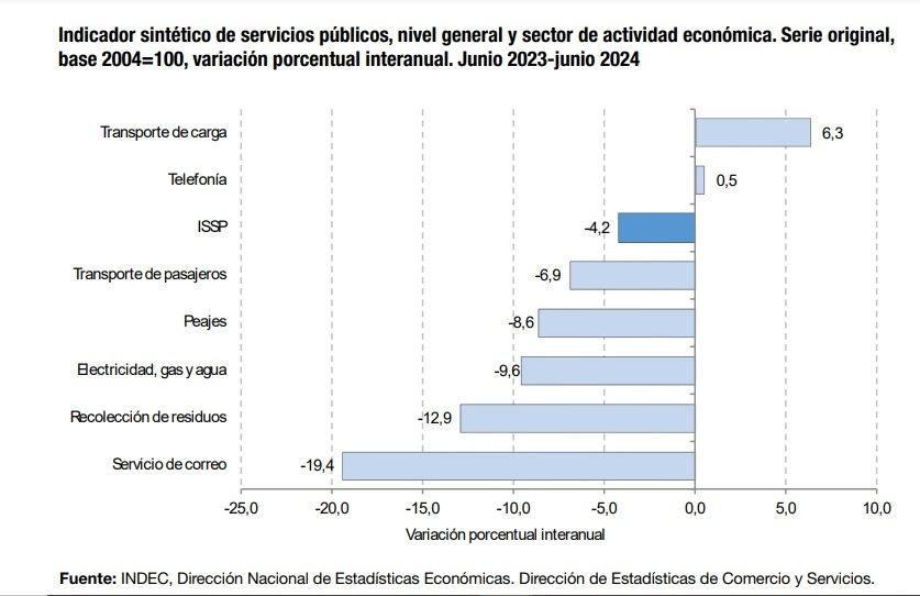 El uso de servicios públicos en el mes de junio de 2024 registró una baja de 4,2% respecto al mismo mes del año anterior con una variación negativa de 2,9% respecto del mes de mayo, según el último informe del Indicador Sintético de Servicios Públicos de Indec.