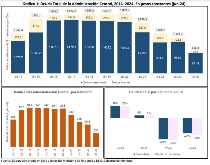 Un reciente informe publicado por el Consejo Empresario de Mendoza (CEM), expuso que la provincia logró reducir a junio de 2024 su deuda pública en un 63% respecto a 2020 y un 45% en la comparación con 2014. Según el último dato oficial publicado, la Deuda Total de la Administración Central mendocina es de $688.415 millones (US$ 755 millones) y la Deuda Consolidada es de $631.574 millones (US$ 693 millones).