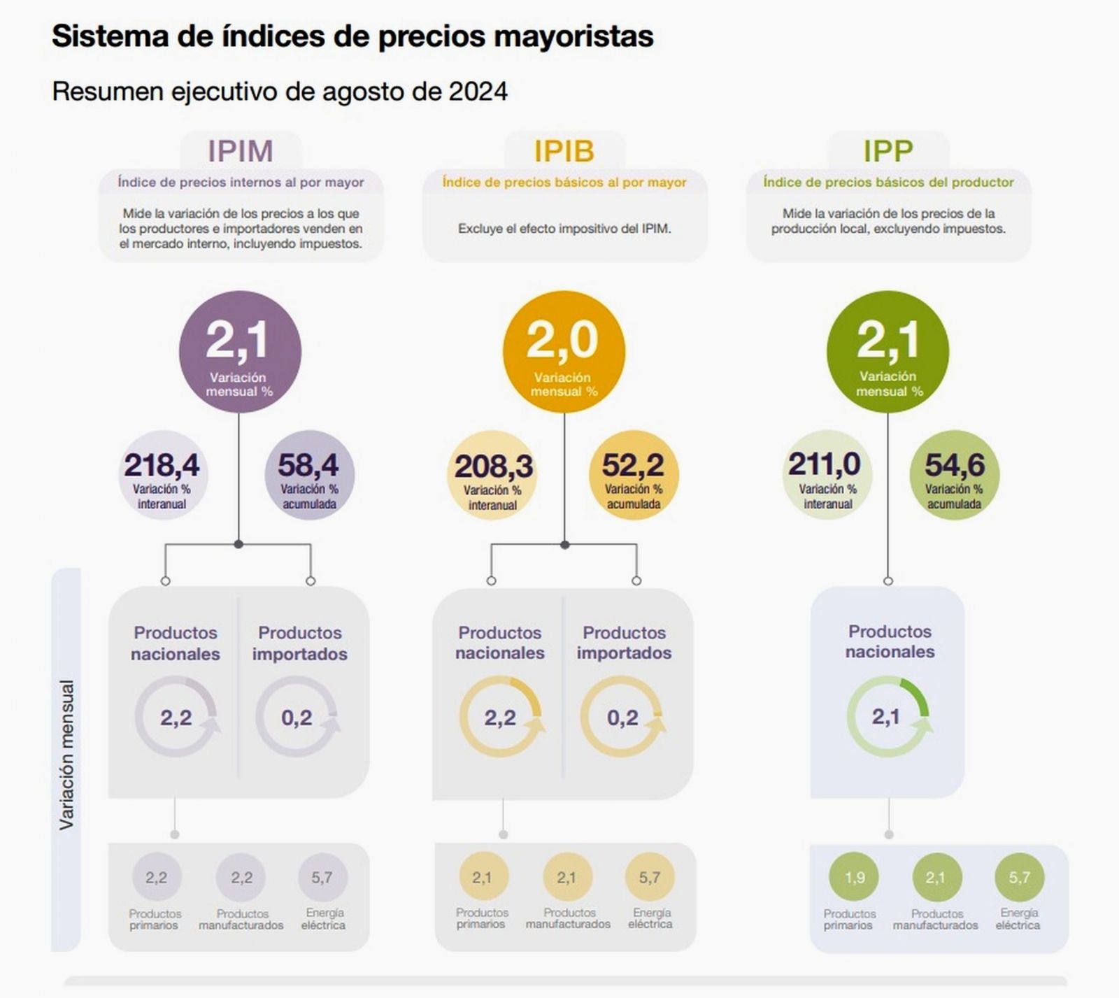 Respecto del nivel general del Índice de precios internos básicos al por mayor (IPIB), el ascenso fue de 2% y el Índice de precios básicos del productor (IPP) registró un incremento de 2,1%.
