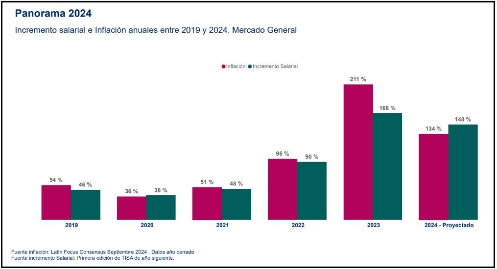La proyección de inflación privada ha disminuido significativamente, ubicándose en 134% (Latin Focus – agosto 2024), mientras que la proyección de inflación de las empresas se sitúa en 140%. En cuanto a los ajustes salariales, otorgarlos cada dos meses sigue siendo la opción predominante entre las empresas, en tanto un 15% de las compañías decide trasladar el 100% de la inflación y no toma en cuenta el mercado para definir los aumentos.