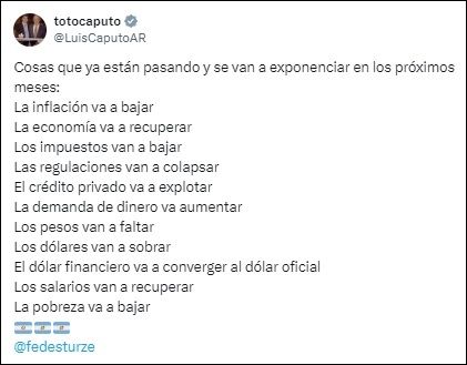 "Cosas que ya están pasando y se van a exponenciar en los próximos meses", escribió Caputo en su cuenta de la misma red social.