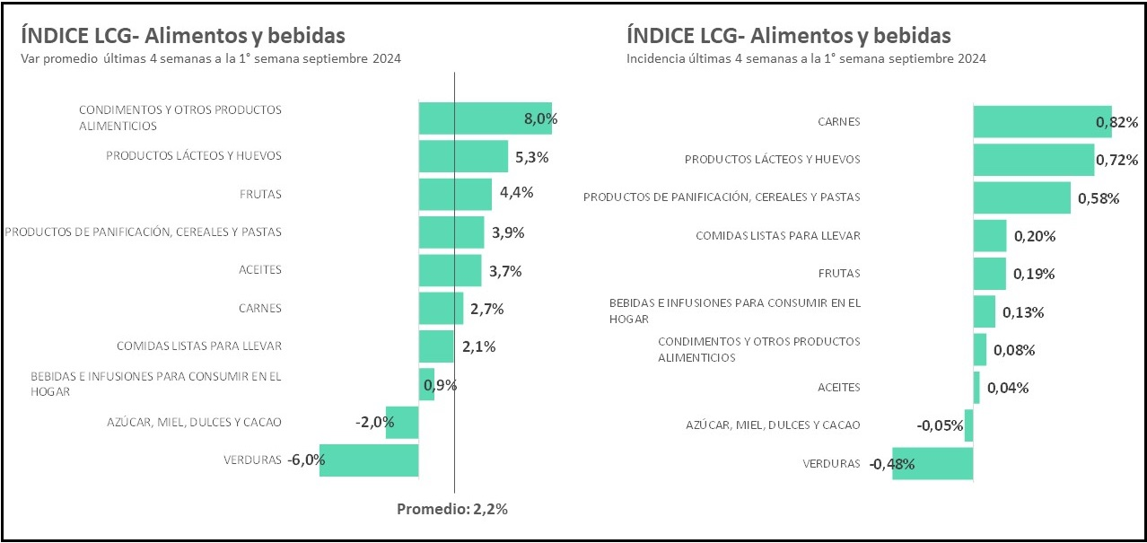En este marco, la consultora LCG dio a conocer un informe sobre la tendencia de aumentos en alimentos y bebidas durante la primera semana de septiembre. El dato es alentador, ya que hubo una importante desaceleración de precios del de 0,7 puntos porcentuales respecto a los siete días previos, y se ubicó en el 0,6% semanal.