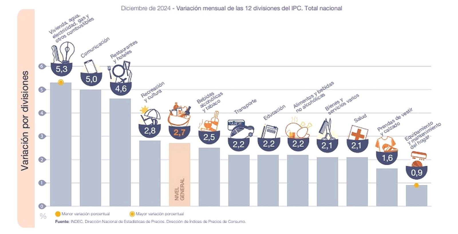 Las dos divisiones con menores variaciones en diciembre de 2024 fueron Prendas de vestir y calzado (1,6%) y Equipamiento y mantenimiento del hogar (0,9%).