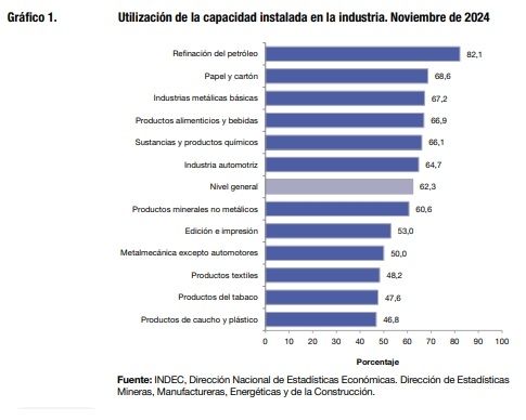 La utilización de la capacidad instalada en la industria se ubicó en un 62,3% en el mes de noviembre, más de dos puntos porcentuales menos que en el mismo mes de 2023, cuando midió 66,4% y un punto menos que en el mes de octubre.