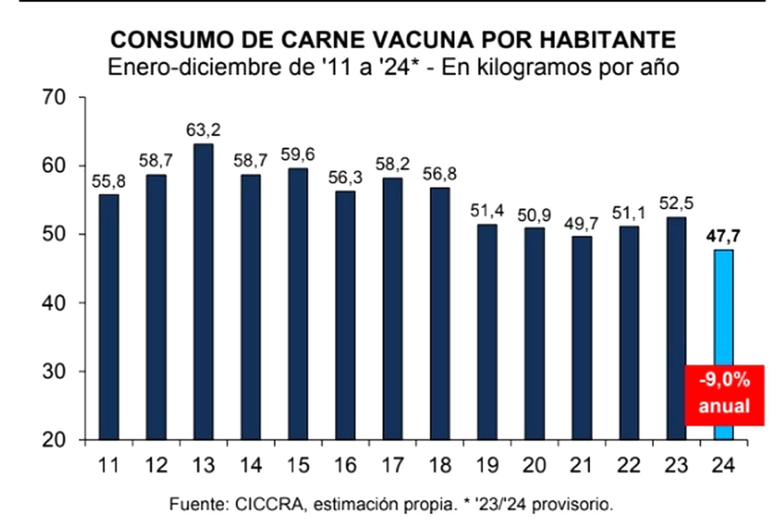 Medido por habitante, el consumo se ubicó en 47,7 kilos por año, un 9% inferior al de 2023 y se convirtió en el segundo registro más bajo desde que se inició la medición en 1914, superado sólo por el registro de 1920, cuando se verificó un nivel inferior al de 2024 (46,9 kilos/hab/año).