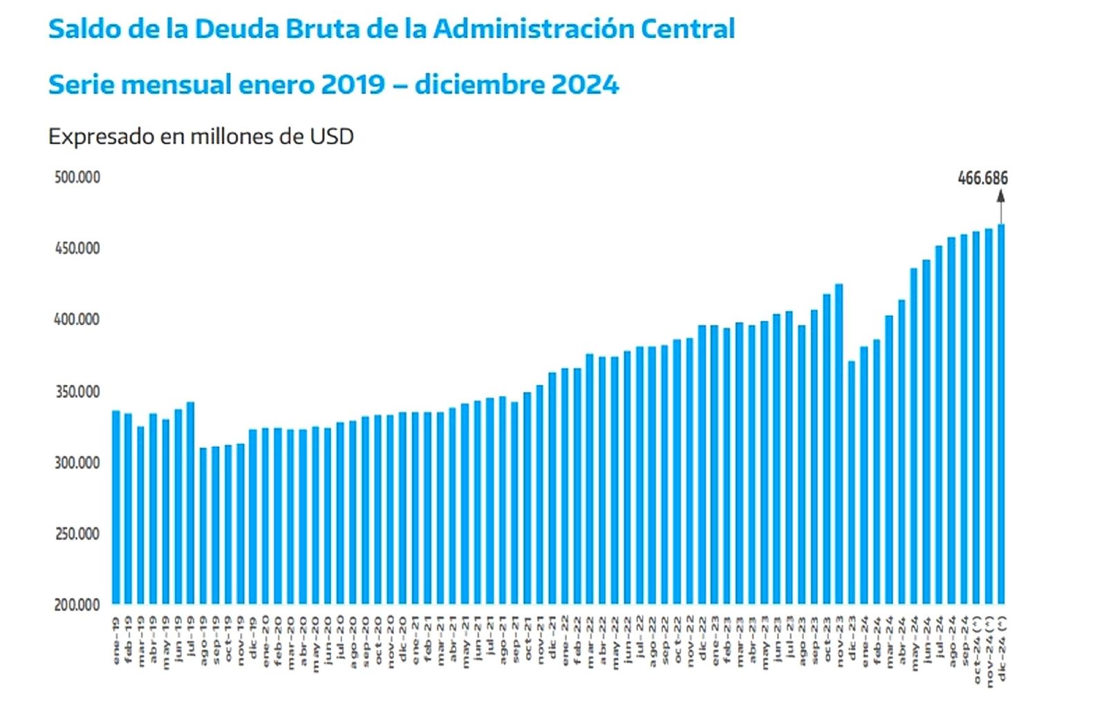 El año 2024 finalizó con una deuda pública bruta récord de US$ 466.866 millones. Esto significa que aumentó algo más de US$96.000 millones en un año. En diciembre de 2023, tras la devaluación del peso, la deuda sumaba US$370.673 millones.