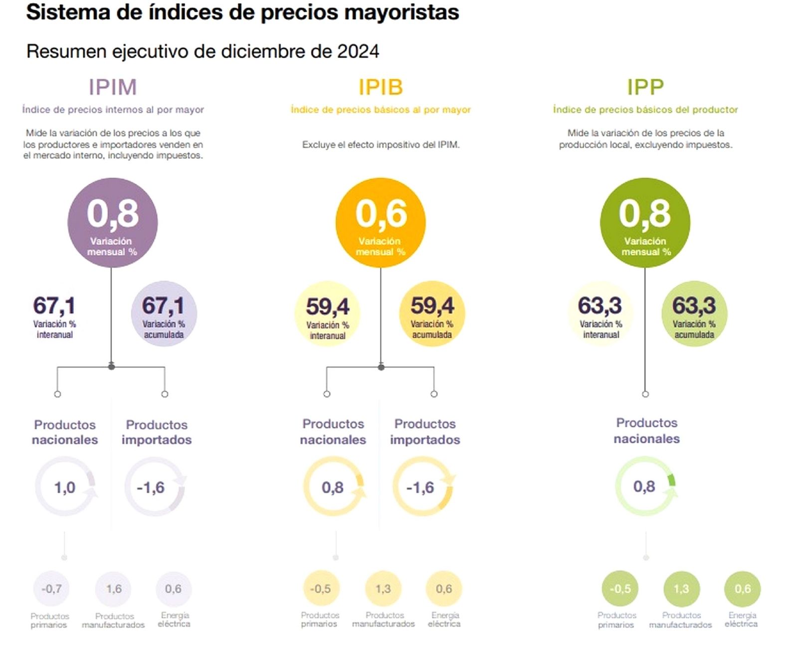 El nivel general del Índice de Precios Básicos del Productor (IPP) registró un incremento de 0,8% en el mismo período, como consecuencia de la baja de 0,6% en los productos primarios, una suba de 1,3% en los productos manufacturados y suba de 0,6% en la energía eléctrica.