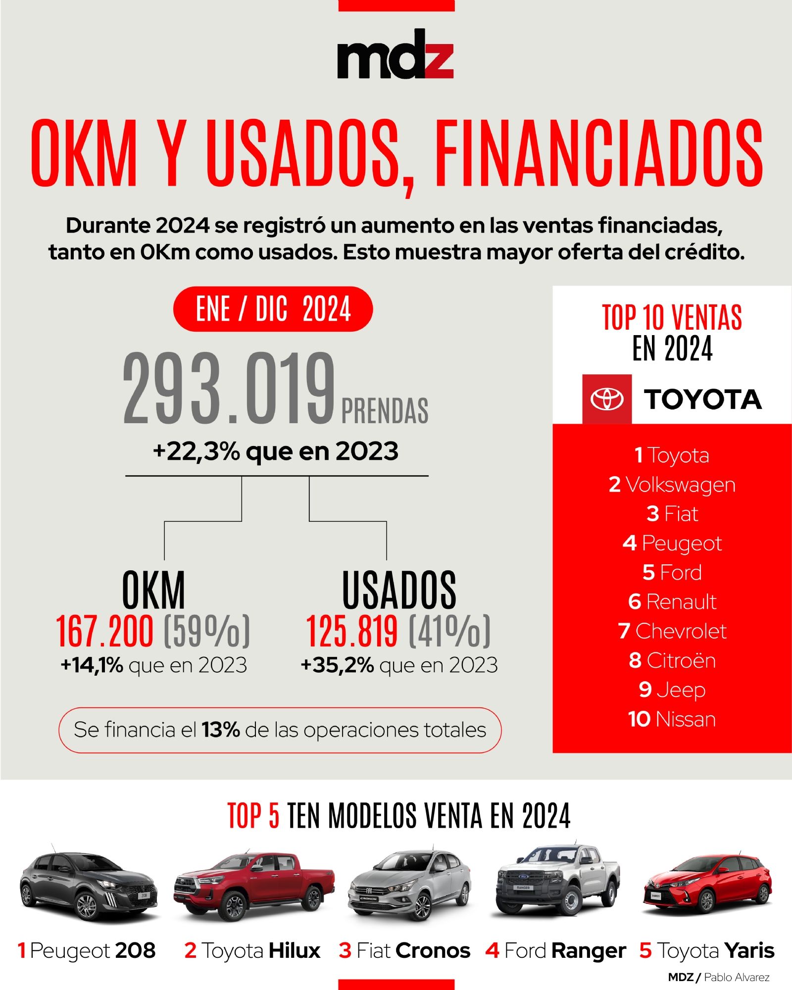 El ranking sigue con Ford Ranger, Yaris, Amarok, Polo, Corolla Cross, Taos y Chevrolet Tracker. En términos generales, en el mercado automotor argentino, se financia el 13% de las operaciones totales, pero en el caso de los 0km, el año pasado se financió el 40% (7 puntos básicos más que en 2023, donde se había financiado el 33%).