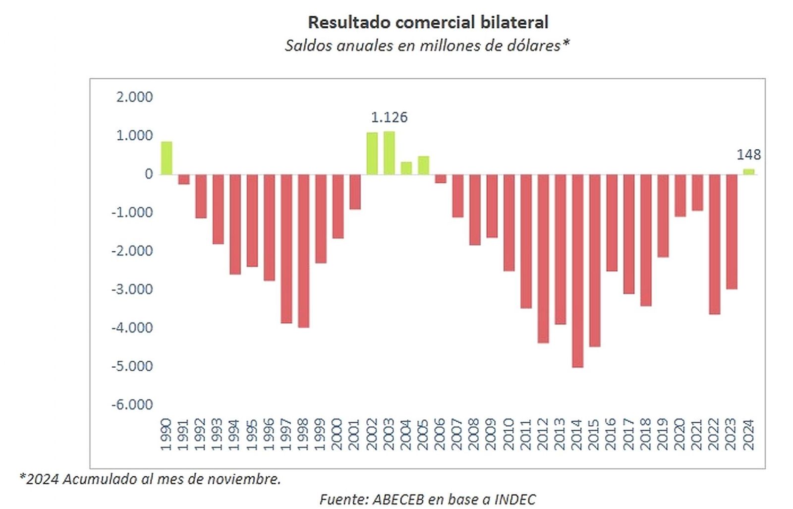 Aunque el saldo de la balanza comercial históricamente fue deficitario para nuestra país, en 2024, en parte por la recesión y la fuerte retracción de las importaciones, se produjo un superávit comercial que sólo se repitió cinco veces en los últimos 35 años.