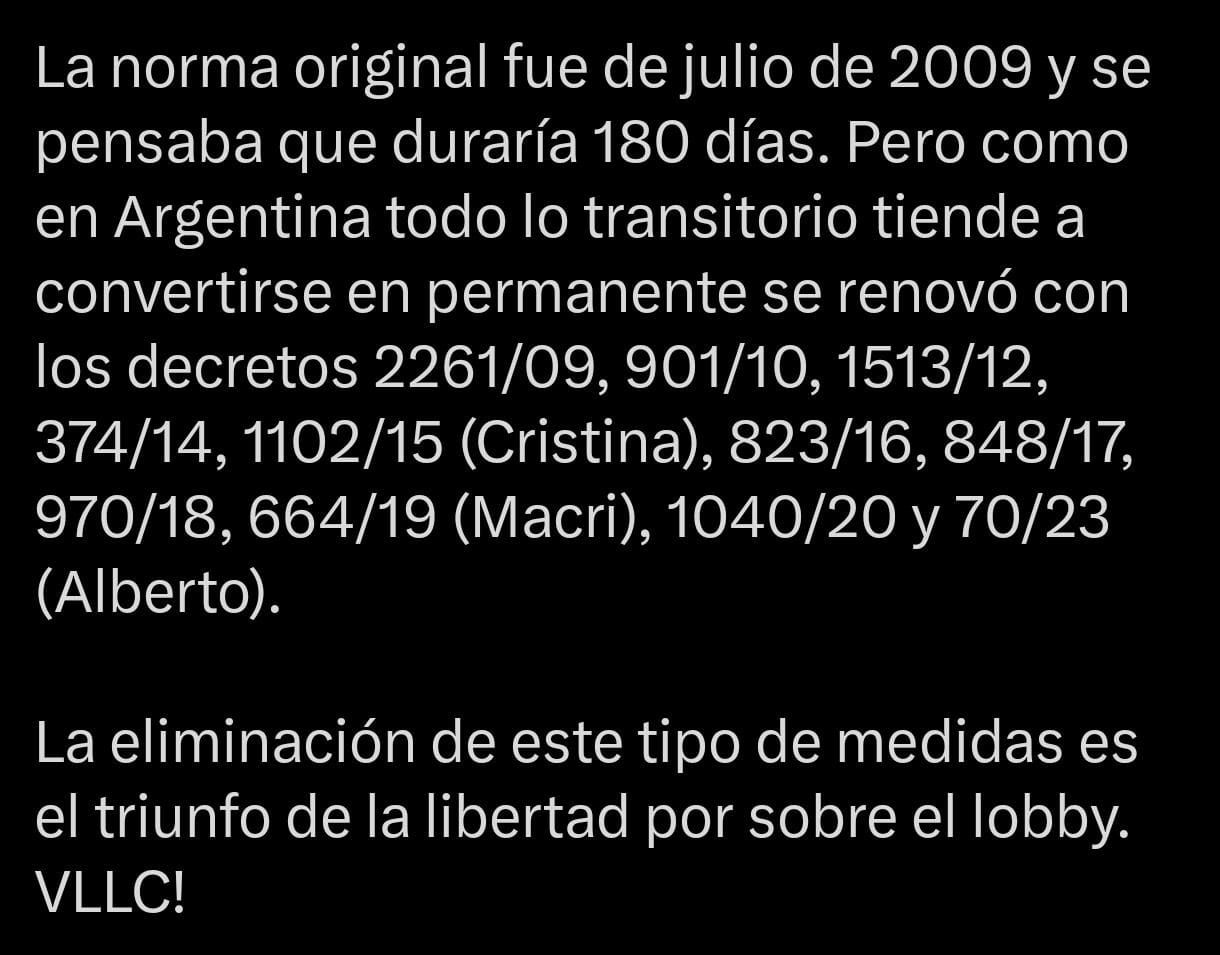 Luego de hacer pública esta decisión y vencido el plazo de 180 días que se estableció originalmente, las diferentes gestiones que siguieron prorrogaron su aplicación. Tal como lo señala Federico Sturzenegger, “se renovó con los decretos 2261/09, 901/10, 1513/12, 374/14, 1102/15 (Cristina), 823/16, 848/17, 970/18, 664/19 (Macri), 1040/20 y 70/23 (Alberto)”.