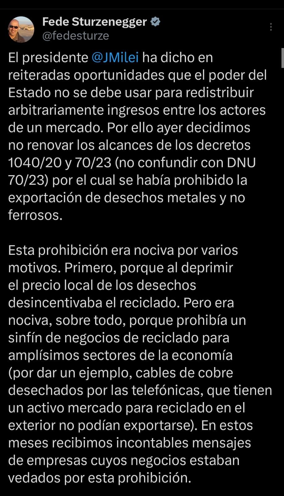 “El presidente Javier Milei ha dicho en reiteradas oportunidades que el poder del Estado no se debe usar para redistribuir arbitrariamente ingresos entre los actores de un mercado. Por ello ayer decidimos no renovar los alcances de los decretos 1040/20 y 70/23 (no confundir con DNU 70/23) por el cual se había prohibido la exportación de desechos metales y no ferrosos”, sostuvo el funcionario en su cuenta oficial de X.
